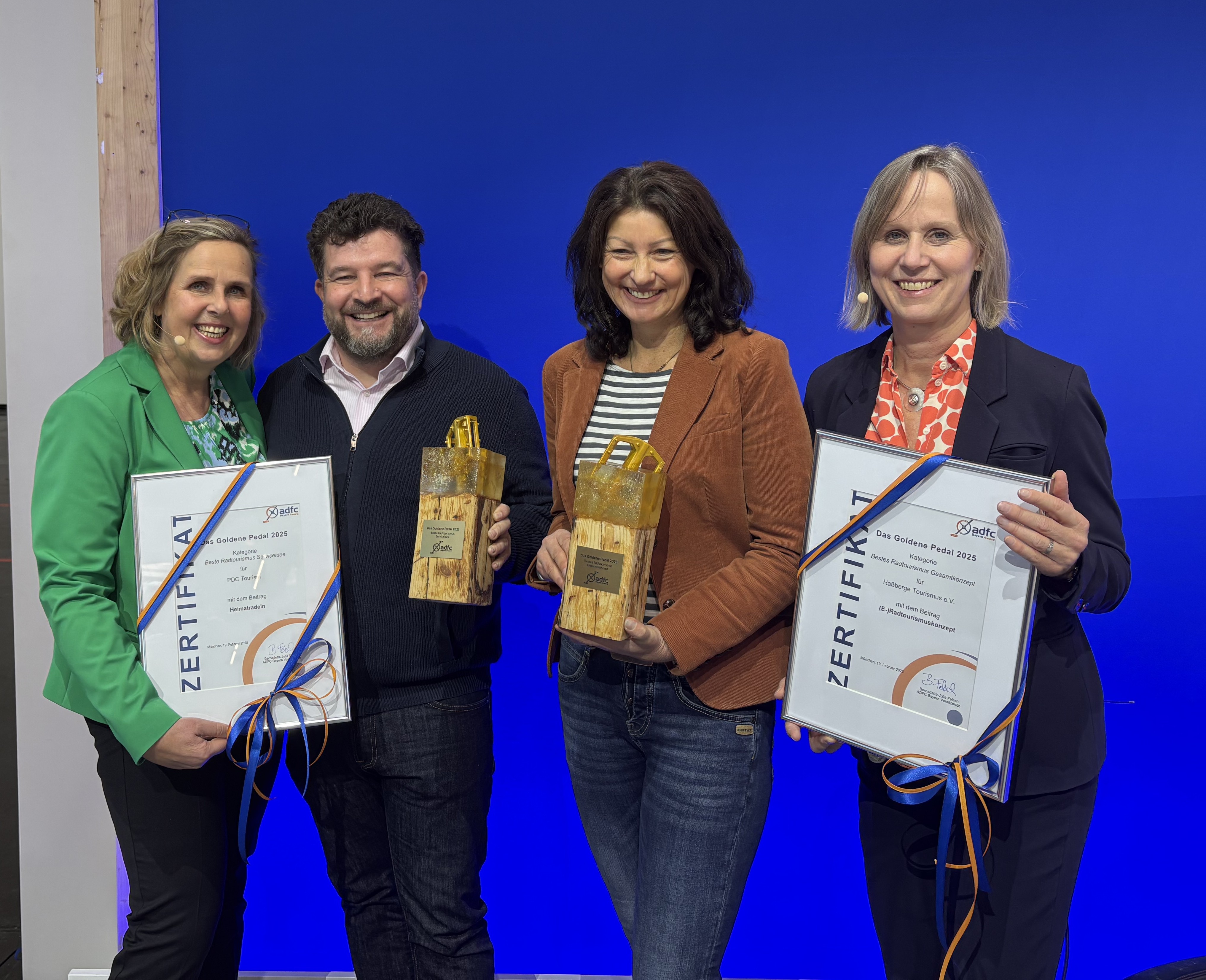 Die Preisverleihung des Goldenen Pedals 2025. V.l.n.r.: Martina Kiderle (ADFC Bayern), Marco Volpe (PDC Tourism), Susanne Volkheimer (Haßberge Tourismus e.V.), Petra Husemann-Roew (ADFC Bayern). © ADFC Bayern